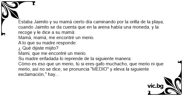 Estaba Jaimito y su mamá cierto día caminando por la orilla de la playa, cuando Jaimito se da cuenta que en la arena había una moneda, y la recoge y le dice a su mamá: