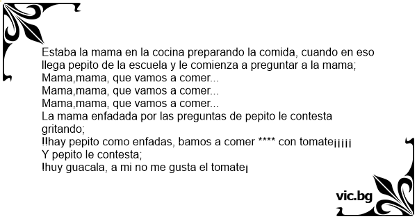 Estaba la mama en la cocina preparando la comida, cuando en eso llega pepito de la escuela y le comienza a preguntar a la mama;
