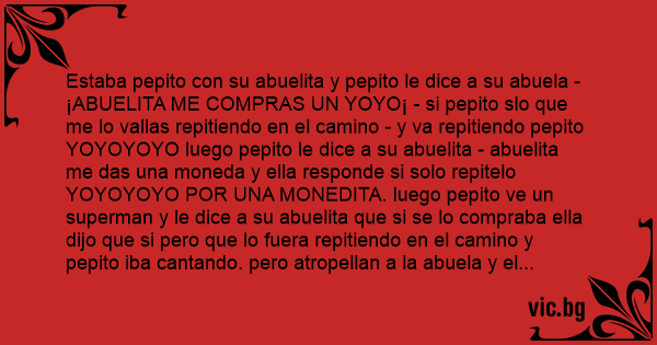 Estaba pepito соn su abuelita y pepito le dice a su abuela - ¡ABUELITA ME COMPRAS UN YOYO¡ - si pepito slo que me lo vallas repitiendo en el camino - y va repitiendo pepito YOYOYOYO luego pepito le dice a su abuelita - abuelita me das una moneda y ella responde si solo repitelo YOYOYOYO POR UNA MONEDITA. luego pepito ve un superman y le dice a su abuelita que si se lo compraba ella dijo que si pero que lo fuera repitiendo en el camino y pepito iba cantando. pero atropellan a la abuela y el policia le pregunta a pepito que quien abia sido a lo que respondio YOYOYOYO ¿ porque? POR UNA MONEDITA ¿quien te crees que eres? SUPERMAN.