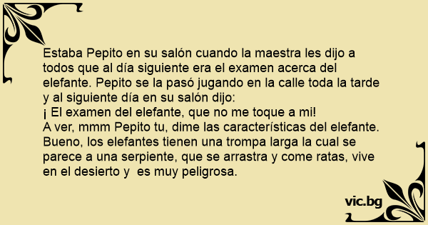 Estaba Pepito en su salón cuando la maestra les dijo a todos que al día siguiente era el examen acerca del elefante. Pepito se la pasó jugando en la calle toda la tarde y al siguiente día en su salón dijo: