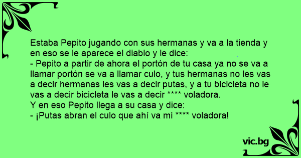 - Pepito a partir de ahora el portón de tu casa ya no se va a llamar portón se va a llamar сulо, y tus hermanas no les vas a decir hermanas les vas a decir putas, y a tu bicicleta no le vas a decir bicicleta le vas a decir **** voladora.