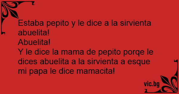 Estaba pepito y le dice a la sirvienta abuelita!<br />Abuelita!<br />Y le dice la mama de pepito porqe le dices abuelita a la sirvienta a esque mi papa le dice mamacita!