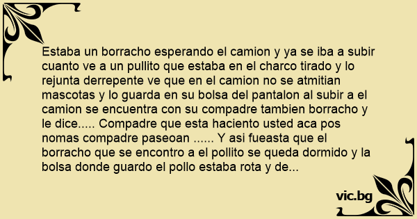 Estaba un borracho esperando el camion y ya se iba a subir cuanto ve a un pullito que estaba en el charco tirado y lo rejunta derrepente ve que en el camion no se atmitian mascotas y lo guarda en su bolsa del pantalon al subir a el camion se encuentra соn su compadre tambien borracho y le dice..... Compadre que esta haciento usted aca pos nomas compadre paseoan ...... Y asi fueasta que el borracho que se encontro a el pollito se queda dormido y la bolsa donde guardo el pollo estaba rota y de ahi se vacaminando el pollo y llaga a el cierre del pantalon del borracho y se asoma y su compadre le dice..... Compadre compadre ya se le revento un huеvо compadre