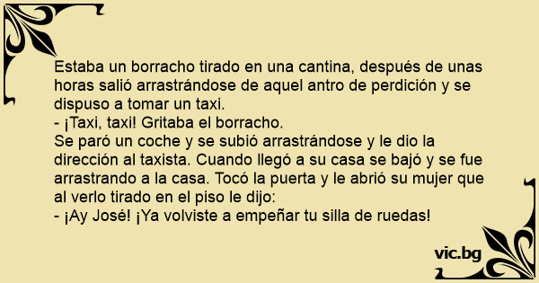 Se paró un coche y se subió arrastrándose y le dio la dirección al taxista. Cuando llegó a su casa se bajó y se fue arrastrando a la casa. Tocó la puerta y le abrió su mujer que al verlo tirado en el piso le dijo: