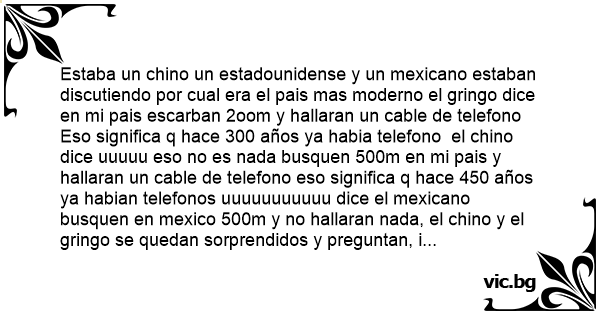 Estaba un chino un estadounidense y un mexicano estaban discutiendo por cual era el pais mas moderno el gringо dice en mi pais escarban 2oom y hallaran un cable de telefono