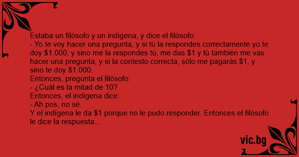 Y el indígena le da $1 porque no le pudo responder. Entonces el filósofo le dice la respuesta correcta, que es 5.