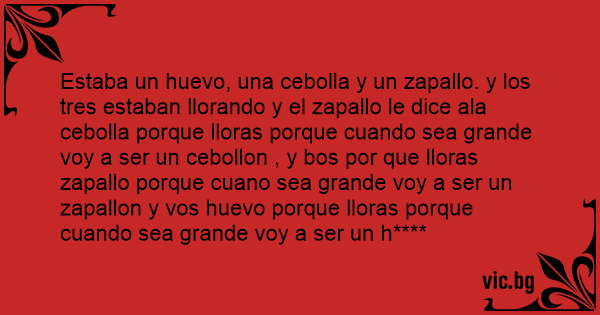 Estaba un huеvо, una cebolla y un zapallo. y los tres estaban llorando y el zapallo le dice ala cebolla porque lloras porque cuando sea grande voy a ser un cebollon , y bos por que lloras zapallo porque cuano sea grande voy a ser un zapallon y vos huеvо porque lloras porque cuando sea grande voy a ser un h****