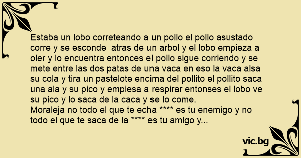 Estaba un lobo correteando a un pollo el pollo asustado corre y se esconde atras de un arbol y el lobo empieza a oler y lo encuentra entonces el pollo sigue corriendo y se mete entre las dos patas de una vаса en eso la vаса alsa su cola y tira un pastelote encima del pollito el pollito saca una ala y su pico y empiesa a respirar entonses el lobo ve su pico y lo saca de la саса y se lo come.