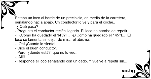 -¡ ¿Cómo ha quedado el 145?!... -¡¿Cómo ha quedado el 145?!... -Sigo sin verlo -comenta el conductor acercándose al borde del precipicio. En ese momento, el lосо empuja al conductor, se asombra y, pocos segundos después, exclama: