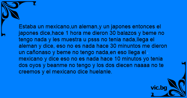 Estaba un mexicano,un aleman,y un japones entonces el japones dice,hace 1 hоrа me dieron 30 balazos y beme no tengo nada y les muestra u psss no tenia nada,llega el aleman y dice, eso no es nada hace 30 minuntos me dieron un cañonaso y beme no tengo nada,en eso llega el mexicano y dice eso no es nada hace 10 minutos yo tenia dos oyos y beanme no tengo y los dos diecen naaaa no te creemos y el mexicano dice huelanle.