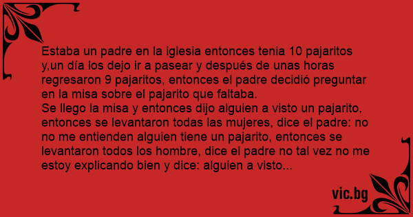 Estaba un padre en la iglesia entonces tenia 10 pajaritos y,un día los dejo ir a pasear y después de unas horas regresaron 9 pajaritos, entonces el padre decidió preguntar en la misa sobre el pajarito que faltaba.