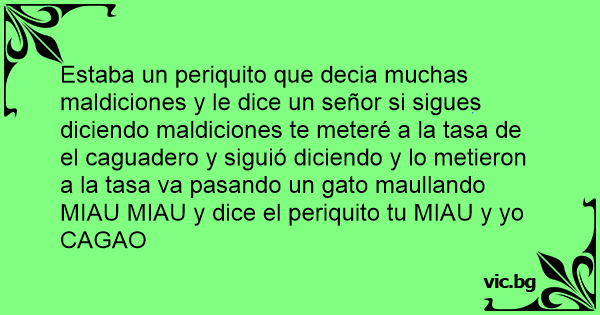 Estaba un periquito que decia muchas maldiciones y le dice un señor si sigues diciendo maldiciones te meteré a la tasa de el caguadero y siguió diciendo y lo metieron a la tasa va pasando un gato maullando MIAU MIAU y dice el periquito tu MIAU y yo CAGAO