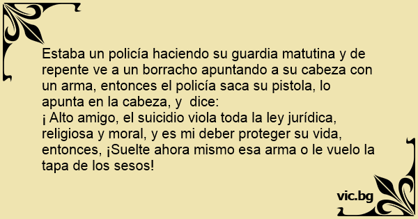 ¡ Alto amigo, el suicidio viola toda la ley jurídica, religiosa y moral, y es mi deber proteger su vida, entonces, ¡Suelte ahora mismo esa arma o le vuelo la tapa de los sesos!