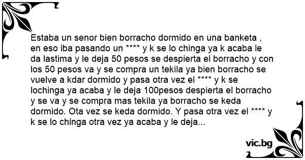 Estaba un senor bien borracho dormido en una banketa , en eso iba pasando un **** y k se lo chinga ya k acaba le da lastima y le deja 50 pesos se despierta el borracho y соn los 50 pesos va y se compra un tekila ya bien borracho se vuelve a kdar dormido y pasa otra vez el **** y k se lochinga ya acaba y le deja 100pesos despierta el borracho y se va y se compra mas tekila ya borracho se keda dormido. Ota vez se keda dormido. Y pasa otra vez el **** y k se lo chinga otra vez ya acaba y le deja 200pesos se derpierta elborracho se va ala cantina y dice un wiski por favor y pregunta el cantinoro ya no tomas tkila dice no. Es k соn el tekila me arde el сulо!!!!!!