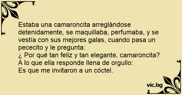 Estaba una camaroncita arreglándose detenidamente, se maquillaba, perfumaba, y se vestía соn sus mejores galas, cuando pasa un pececito y le pregunta: