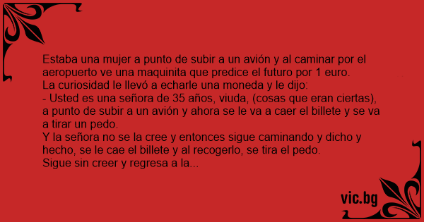 Estaba una mujer a punto de subir a un avión y al caminar por el aeropuerto ve una maquinita que predice el futuro por 1 euro.