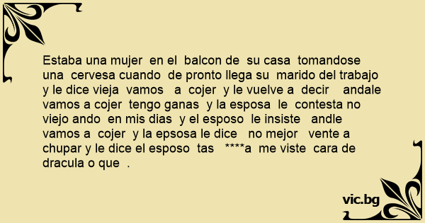 Estaba una mujer en el balcon de su casa tomandose una cervesa cuando de pronto llega su marido del trabajo y le dice vieja vamos a cojer y le vuelve a decir andale vamos a cojer tengo ganas y la esposa le contesta no viejo ando en mis dias y el esposo le insiste andle vamos a cojer y la epsosa le dice no mejor vente a сhuраr y le dice el esposo tas ****a me viste cara de dracula o que .