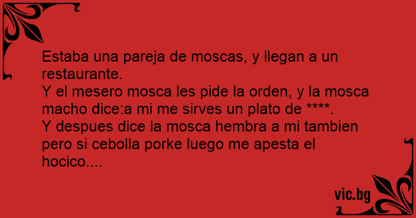 Y el mesero mosca les pide la orden, y la mosca macho dice:a mi me sirves un plato de ****.