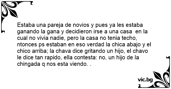 Estaba una pareja de novios y pues ya les estaba ganando la gana y decidieron irse a una casa en la cual no vivia nadie, pero la casa no tenia techo, ntonces ps estaban en eso verdad la chica abajo y el chico arriba; la chava dice gritando un hijo, el chavo le dice tan rapido, ella contesta: no, un hijo de la chingada q nos esta viendo. .