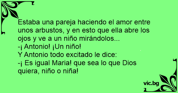 Estaba una pareja haciendo el amor entre unos arbustos, y en esto que ella abre los ojos y ve a un niño mirándolos...
