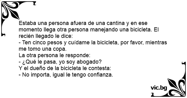 Estaba una persona afuera de una cantina y en ese momento llega otra persona manejando una bicicleta. El recién llegado le dice:
