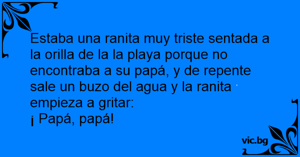 Estaba una ranita muy triste sentada a la orilla de la la playa porque no encontraba a su papá, y de repente sale un buzo del agua y la ranita empieza a gritar: