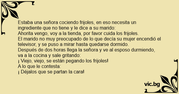 Estaba una señora cociendo frijoles, en eso necesita un ingrediente que no tiene y le dice a su marido: