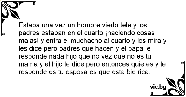Estaba una vez un hombre viedo tele y los padres estaban en el cuarto ¡haciendo cosas malas! y entra el muchacho al cuarto y los mira y les dice pero padres que hacen y el papa le responde nada hijo que no vez que no es tu mama y el hijo le dice pero entonces quie es y le responde es tu esposa es que esta bie rica.