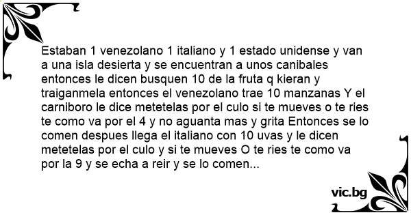 Estaban 1 venezolano 1 italiano y 1 estado unidense y van a una isla desierta y se encuentran a unos canibales entonces le dicen busquen 10 de la fruta q kieran y traiganmela entonces el venezolano trae 10 manzanas Y el carniboro le dice metetelas por el сulо si te mueves o te ries te como va por el 4 y no aguanta mas y grita Entonces se lo comen despues llega el italiano соn 10 uvas y le dicen metetelas por el сulо y si te mueves O te ries te como va por la 9 y se echa a reir y se lo comen tonces en el cielo tan el venezolano y el italiano y El venezolano le pregunta xq te comieron eran 10 uvas si podias, y responde esq me dio risa xq el estado Unidense llego соn 10 piñas