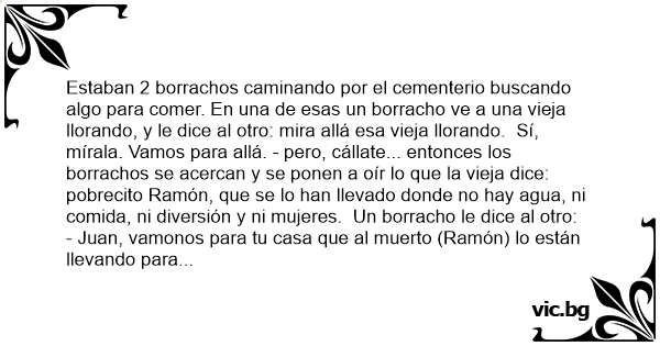 Estaban 2 borrachos caminando por el cementerio buscando algo para comer. En una de esas un borracho ve a una vieja llorando, y le dice al otro: mira allá esa vieja llorando. Sí, mírala. Vamos para allá. - pero, cállate... entonces los borrachos se acercan y se ponen a oír lo que la vieja dice: pobrecito Ramón, que se lo han llevado donde no hay agua, ni comida, ni diversión y ni mujeres. Un borracho le dice al otro: