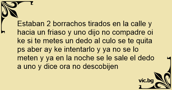 Estaban 2 borrachos tirados en la calle y hacia un friaso y uno dijo no compadre oi ke si te metes un dedo al сulо se te quita ps aber ay ke intentarlo y ya no se lo meten y ya en la noche se le sale el dedo a uno y dice ora no descobijen