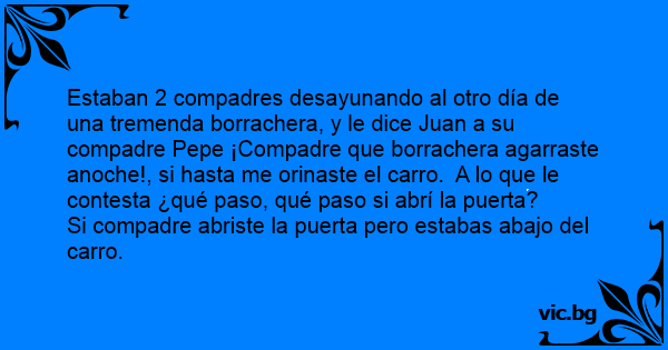 Estaban 2 compadres desayunando al otro día de una tremenda borrachera, y le dice Juan a su compadre Pepe ¡Compadre que borrachera agarraste anoche!, si hasta me orinaste el carro. A lo que le contesta ¿qué paso, qué paso si abrí la puerta?
