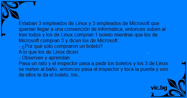 Estaban 3 empleados de Linux y 3 empleados de Microsoft que querían llegar a una convención de informática, entonces suben al tren todos y los de Linux compran 1 boleto mientras que los de Microsoft compran 3 y dicen los de Microsoft: