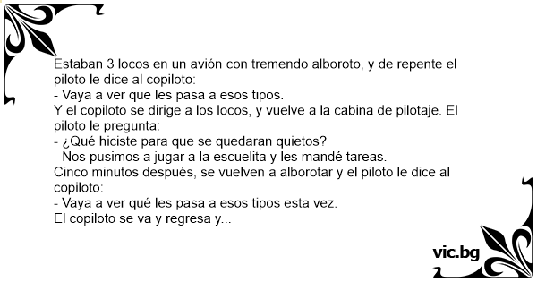 Estaban 3 locos en un avión соn tremendo alboroto, y de repente el piloto le dice al copiloto: