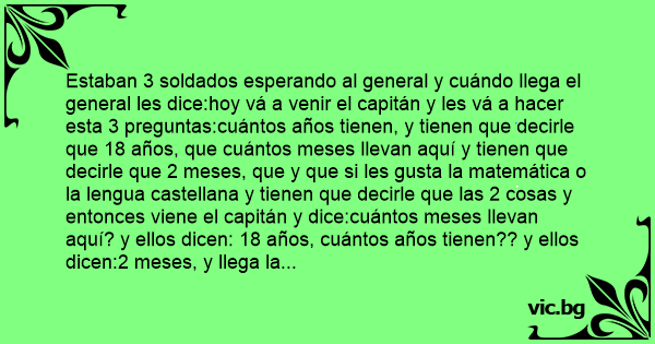 Estaban 3 soldados esperando al general y cuándo llega el general les dice:hoy vá a venir el capitán y les vá a hacer esta 3 preguntas:cuántos años tienen, y tienen que decirle que 18 años, que cuántos meses llevan aquí y tienen que decirle que 2 meses, que y que si les gusta la matemática o la lengua castellana y tienen que decirle que las 2 cosas y entonces viene el capitán y dice:cuántos meses llevan aquí? y ellos dicen: 18 años, cuántos años tienen?? y ellos dicen:2 meses, y llega la última pregunta: es que ustedes son bobos o tontos? y los soldados dicen:las 2 cosas.