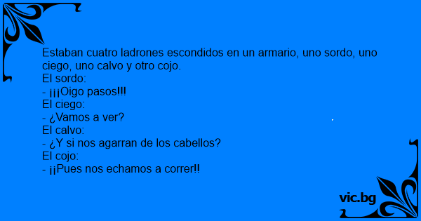 Estaban cuatro ladrones escondidos en un armario, uno sordo, uno ciego, uno calvo y otro cojo.