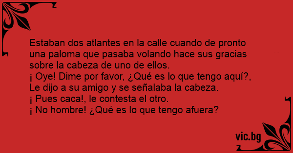 Estaban dos atlantes en la calle cuando de pronto una paloma que pasaba volando hace sus gracias sobre la cabeza de uno de ellos.