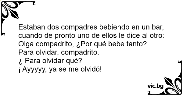 Estaban dos compadres bebiendo en un bar, cuando de pronto uno de ellos le dice al otro: