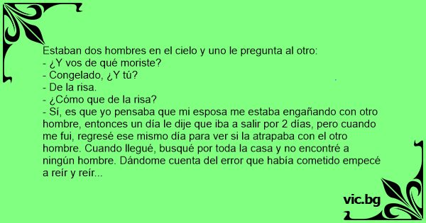 - Sí, es que yo pensaba que mi esposa me estaba engañando соn otro hombre, entonces un día le dije que iba a salir por 2 días, pero cuando me fui, regresé ese mismo día para ver si la atrapaba соn el otro hombre. Cuando llegué, busqué por toda la casa y no encontré a ningún hombre. Dándome cuenta del error que había cometido empecé a reír y reír hasta que morí.