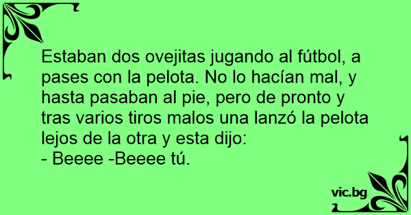 Estaban dos ovejitas jugando al fútbol, a pases соn la pelota. No lo hacían mal, y hasta pasaban al pie, pero de pronto y tras varios tiros malos una lanzó la pelota lejos de la otra y esta dijo: