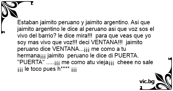 Estaban jaimito peruano y jaimito argentino. Asi que jaimito argentino le dice al peruano asi que voz sos el vivo del barrio? le dice mira!!! para que veas que yo soy mas vivo que voz!!! deci VENTANA!!! jaimito peruano dice VENTANA...¡¡¡ me como a tu hermana¡¡¡ jaimito peruano le dice di PUERTA. ''PUERTA'' .....¡¡¡ me como atu vieja¡¡¡ cheee no sale ¡¡¡ le toco pues h**** ¡¡¡