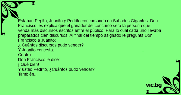 Estaban Pepito, Juanito y Pedrito concursando en Sábados Gigantes. Don Francisco les explica que el ganador del concurso será la persona que venda más discursos escritos entre el público. Para lo cual cada uno llevaba preparados cien discursos. Al final del tiempo asignado le pregunta Don Francisco a Juanito: