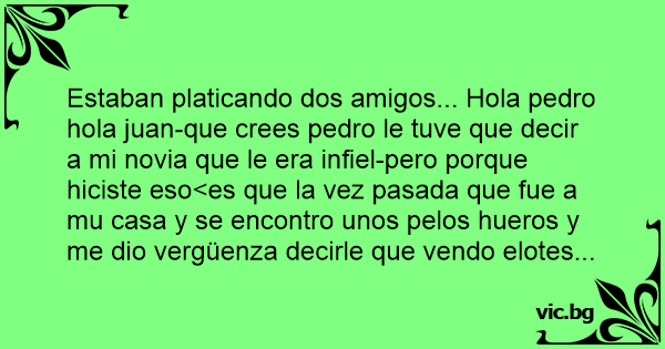 Estaban platicando dos amigos... Hola pedro hola juan-que crees pedro le tuve que decir a mi novia que le era infiel-pero porque hiciste eso<es que la vez pasada que fue a mu casa y se encontro unos pelos hueros y me dio vergüenza decirle que vendo elotes...