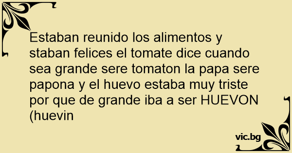 Estaban reunido los alimentos y staban felices el tomate dice cuando sea grande sere tomaton la papa sere papona y el huеvо estaba muy triste por que de grande iba a ser HUEVON (huevin