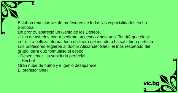 - Uno de ustedes podrá pedirme un deseo y solo uno. Tendrá que elegir entre: La belleza eterna, todo el dinero del mundo o La sabiduría perfecta.