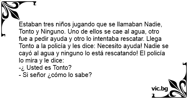 Estaban tres niños jugando que se llamaban Nadie, Тоnто y Ninguno. Uno de ellos se cae al agua, otro fue a pedir ayuda y otro lo intentaba rescatar. Llega Тоnто a la policía y les dice: Necesito ayuda! Nadie se cayó al agua y ninguno lo está rescatando! El policía lo mira y le dice: