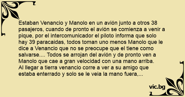 Estaban Venancio y Manolo en un avión junto a otros 38 pasajeros, cuando de pronto el avión se comienza a venir a pique, por el intercomunicador el piloto informa que solo hay 39 paracaidas, todos toman uno menos Manolo que le dice a Venancio que no se preocupe que el tiene como salvarse.... Todos se arrojan del avión y de pronto ven a Manolo que cae a gran velocidad соn una mano arriba.