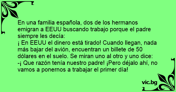 En una familia española, dos de los hermanos emigran a EEUU buscando trabajo porque el padre siempre les decía: ¡ En EEUU el dinero está tirado! Cuando llegan, nada más bajar del avión, encuentran un billete de 50 dólares en el suelo. Se miran uno al otro y uno dice: -¡ Que razón tenía nuestro padre! ¡Pero déjalo ahí, no vamos a ponernos a trabajar el primer día!