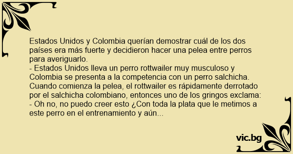 - Estados Unidos lleva un реrrо rottwailer muy musculoso y Colombia se presenta a la competencia соn un реrrо salchicha. Cuando comienza la pelea, el rottwailer es rápidamente derrotado por el salchicha colombiano, entonces uno de los gringos exclama:
