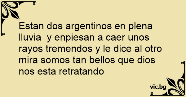 Estan dos argentinos en plena lluvia y enpiesan a caer unos rayos tremendos y le dice al otro mira somos tan bellos que dios nos esta retratando